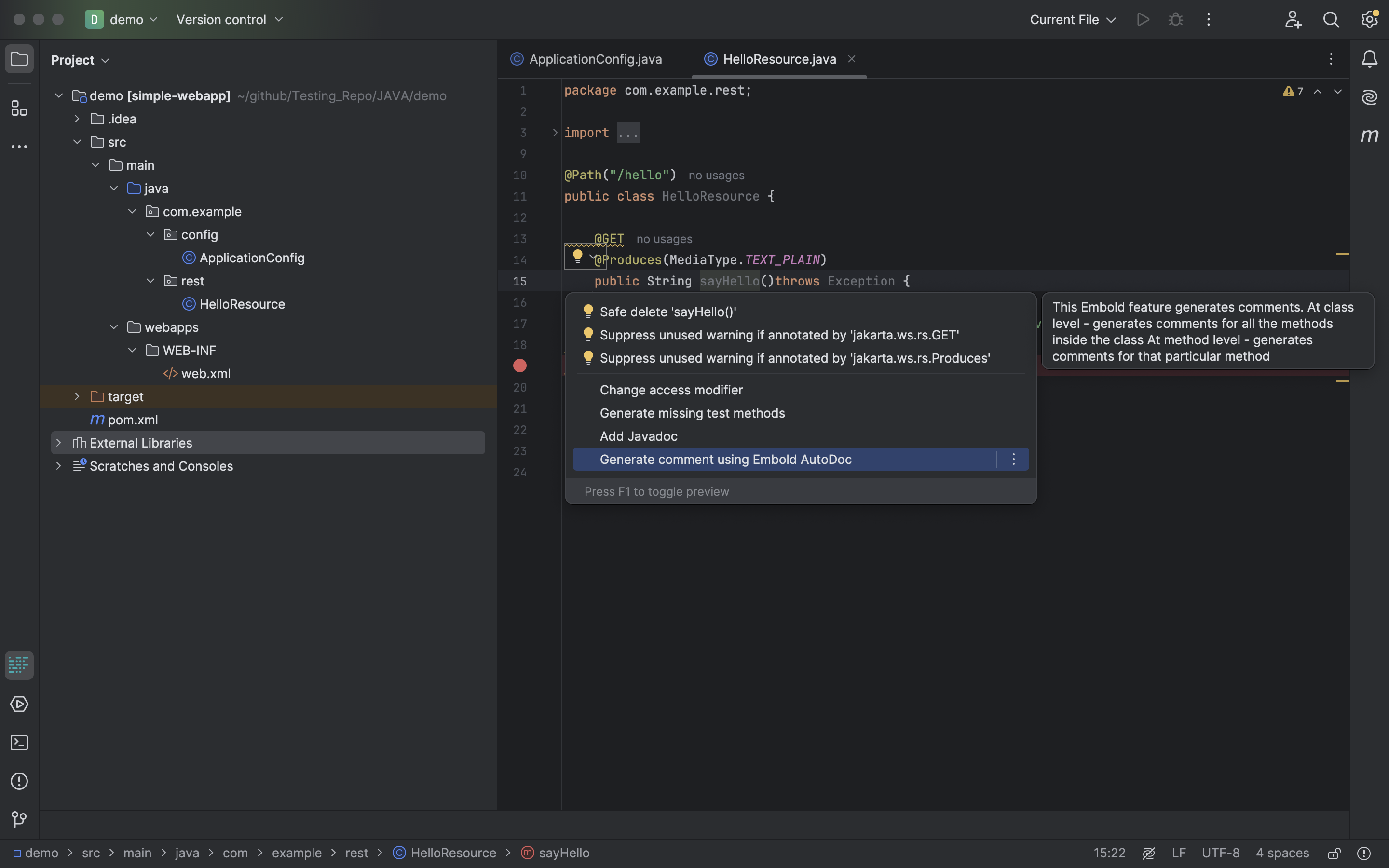 B. You can also select the method name and use the shortcut key as ‘Alt + Shift + D’ to generate Java docs using Embold.