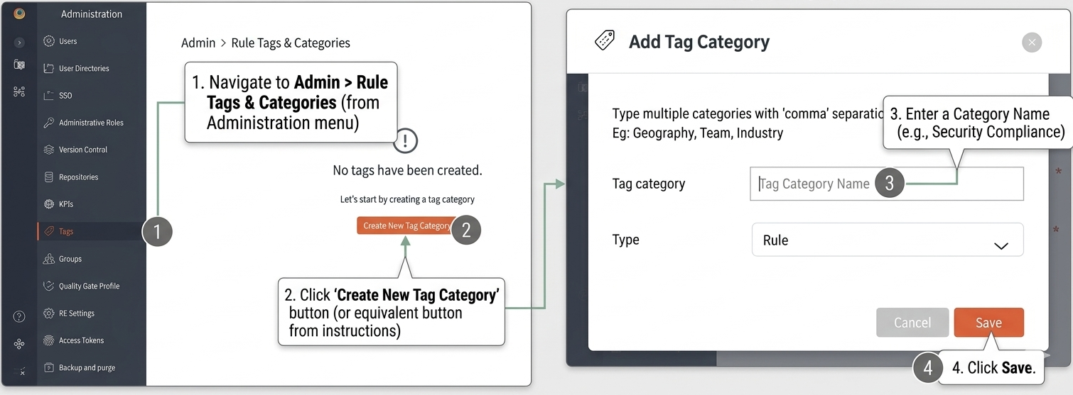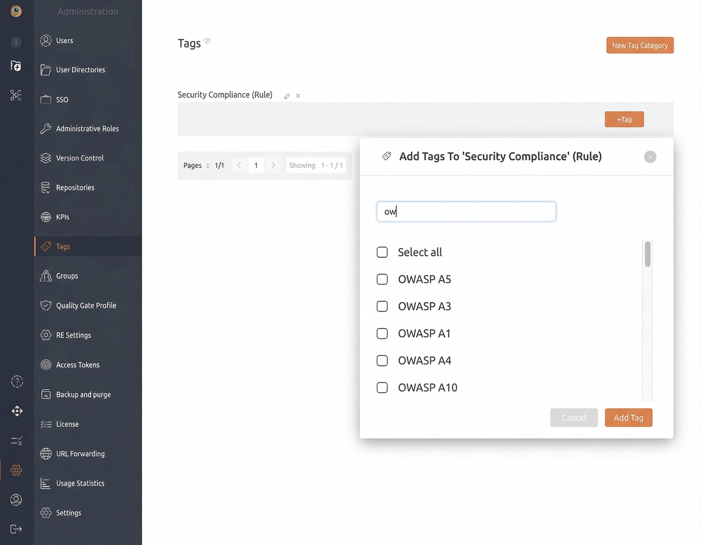 Rule Tags and Categories allow you to create a custom taxonomy for your code issues. Instead of relying only on default "Bugs" or "Vulnerabilities," you can organize issues by Team, Compliance Standards (e.g., OWASP), or Internal Priorities.