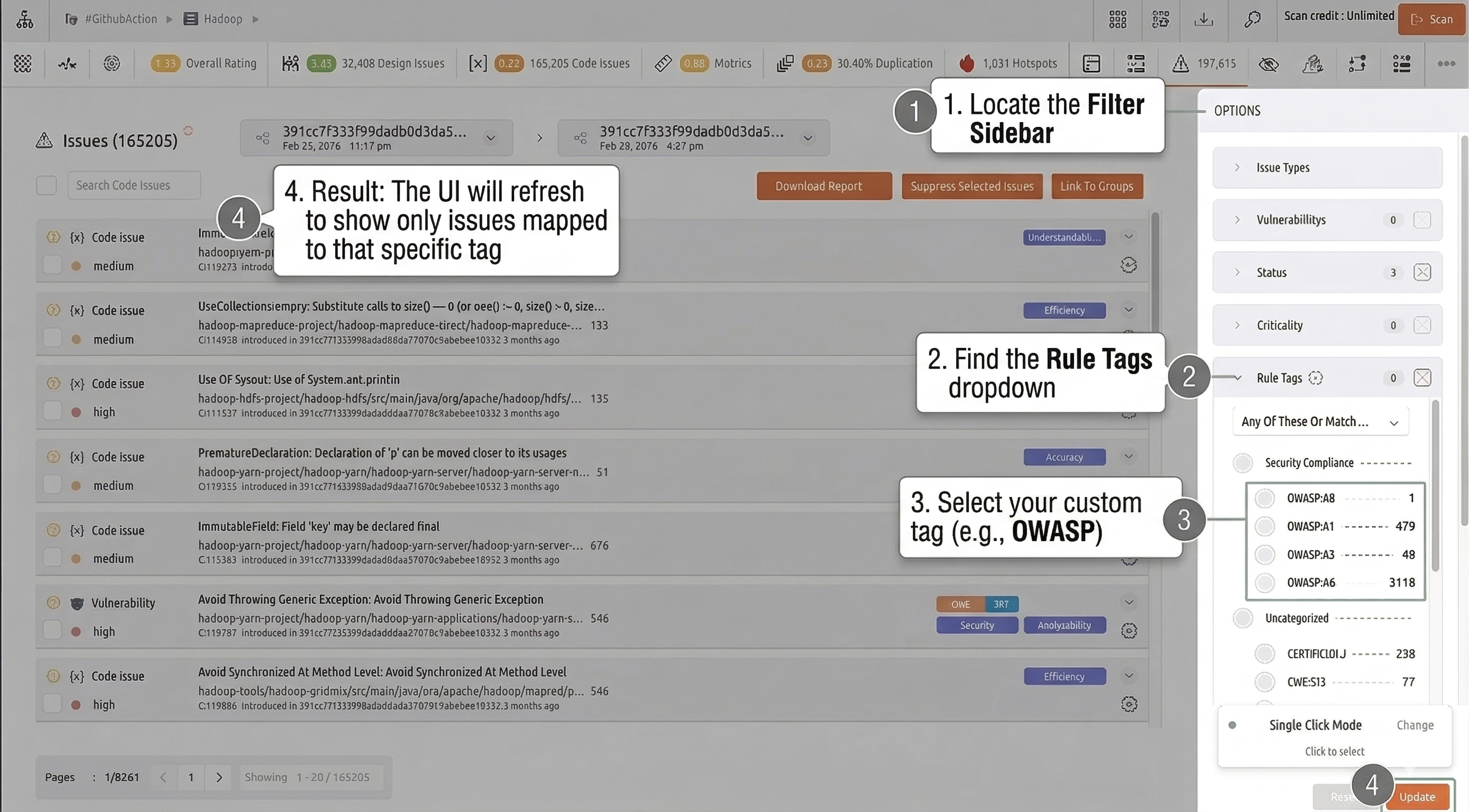 OWASP). - Result: The UI will refresh to show only the issues mapped to that specific compliance tag.
