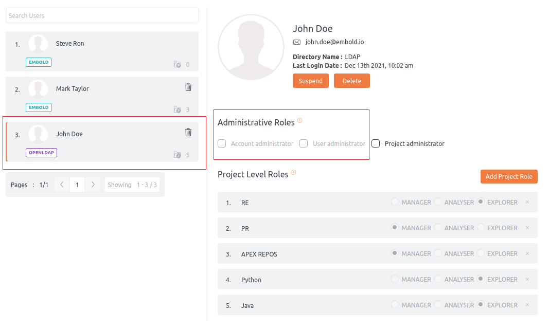 If a project name defined in an LDAP group no longer exists or is invalid, BrowserStack Code Quality will disable the associated role in the UI. For example, if project RE is defined but unavailable, code_quality_manager_RE will be disabled under Project-Level Roles.